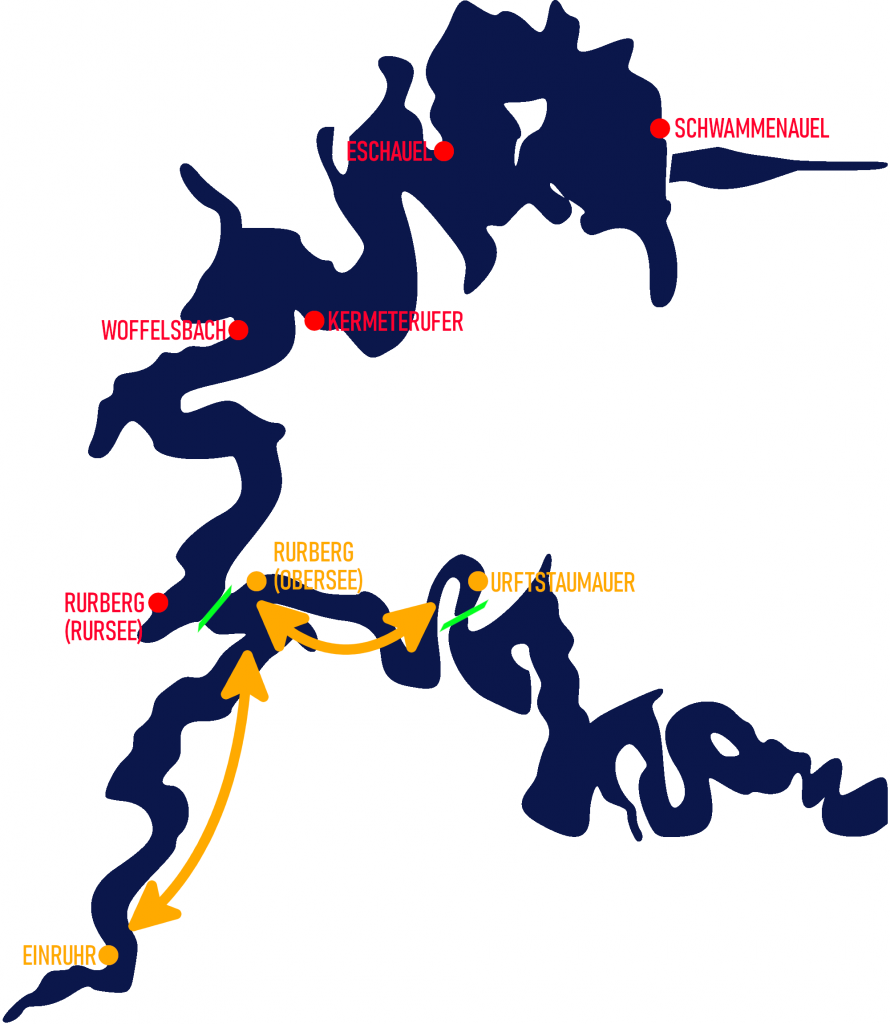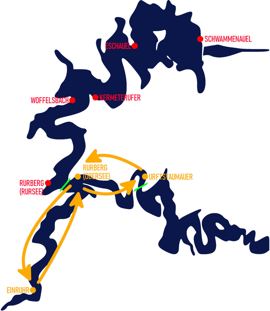 • von Schwammenauel zur Urftstaumauer und wieder zurück: bitte machen Sie die 2-Seen-Rundfahrt 3 Stunden. In Rurberg/Obersee müssen Sie das Schiff zur Urftstaumauer nehmen. Bitte planen Sie vier Stunden Zeit ein!